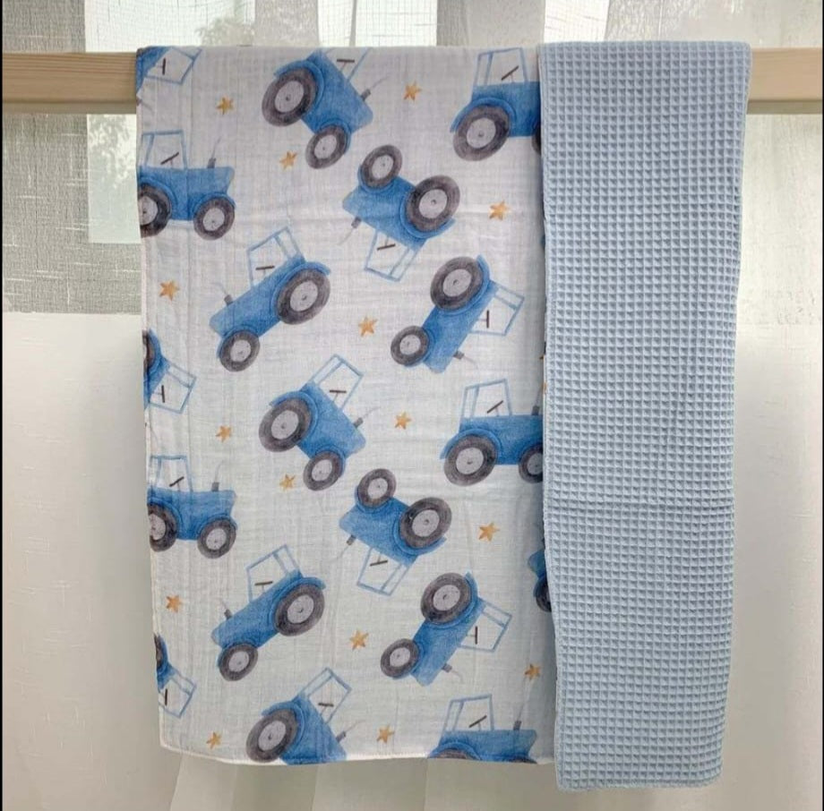 Double-Sided Design: Our waffle blankets are double-sided, offering both functionality and style. One side features a delightful waffle texture for a tactile experience, while the reverse showcases a beautiful patterned muslin. You get the best of both worlds in a single, versatile blanket.