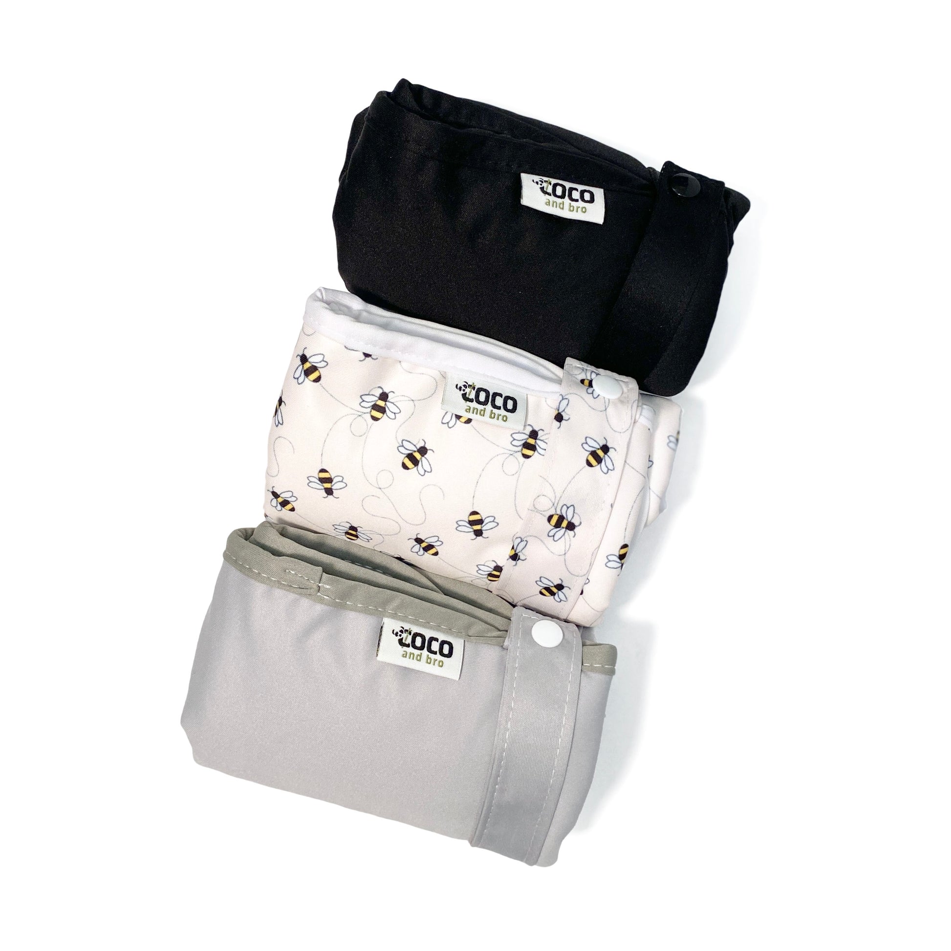 Available in three stylish designs—Black, for a sleek and modern look; Grey, for a versatile, neutral option; and the playful Bumble Bee Design, adding a cheerful touch to your diaper-changing routine. Each mat is made from sustainable bamboo fabric, making it a soft, durable, and eco-friendly alternative to disposable changing mats.